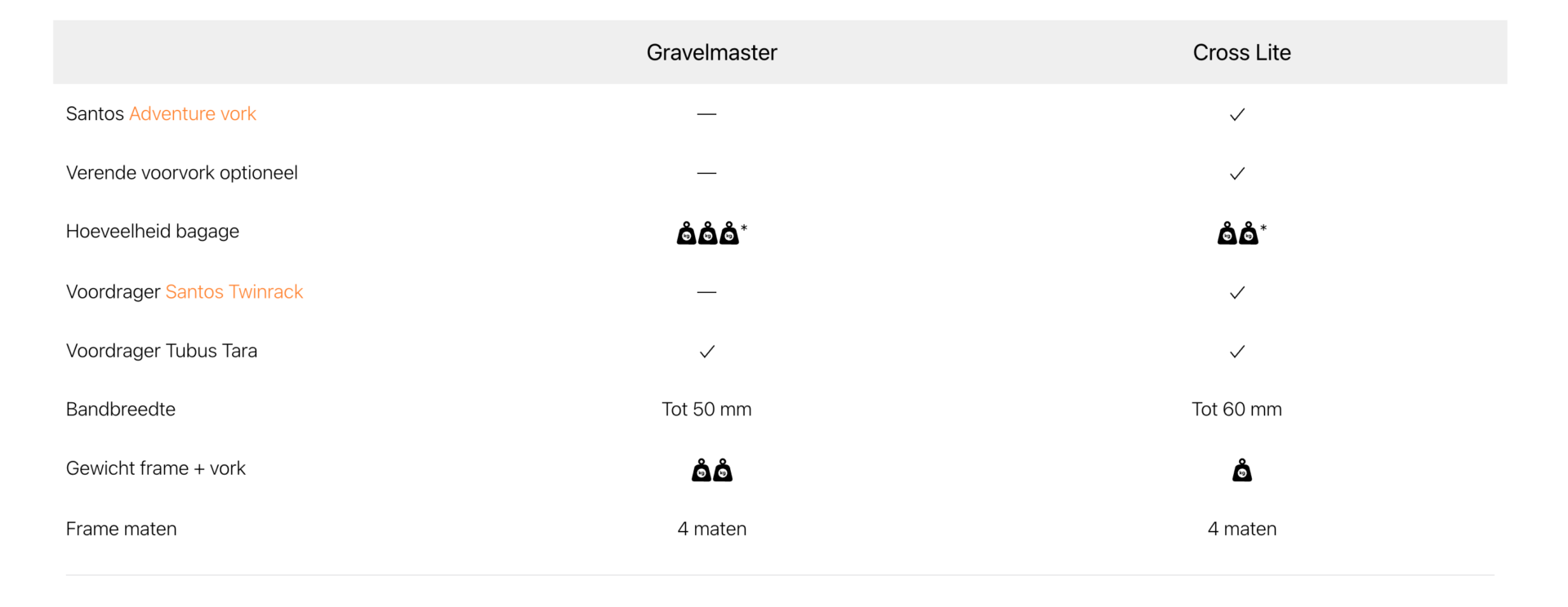 Je kunt kiezen uit twee modellen: de Gravelmaster en de Cross Lite. De verschillen zijn niet groot. Je kunt ze het beste even zelf ervaren tijdens een flinke testrit. Bouw je gravelbike custom op, zodat ‘ie helemaal past bij jouw rijstijl. Met de juiste aandrijving en handige accessoires. En vergeet niet om een coole Santos kleur uit te kiezen.