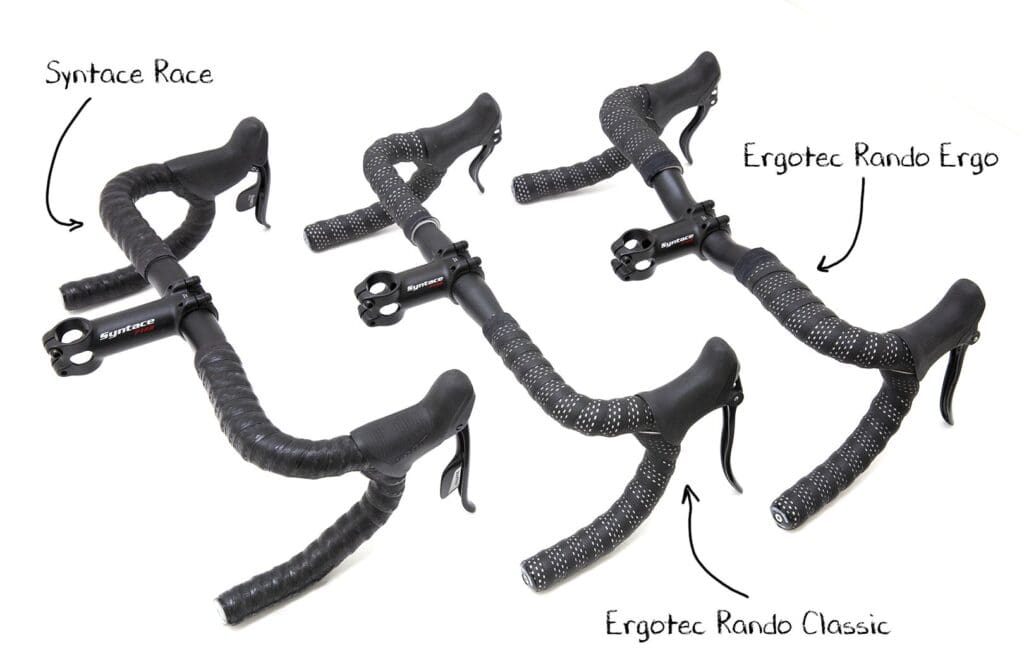 Ook het Syntace Race stuur (links) of het Ergotec Rando Classic stuur (midden) zijn een goede keus. Gewoon uitproberen op de Santos pasfiets of tijdens een testrit buiten, want iedere rijder is uniek en heeft een eigen voorkeur.