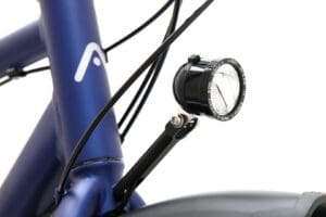 Kies je voor SON verlichting, dan krijg je een mooie koplamp met een brede, heldere lichtbundel, die zo kenmerkend is voor SON koplampen. De aansluiting bij de naafdynamo is stekkerloos, zodat het wiel er gemakkelijk in en uit gehaald kan worden. We monteren de lamp op een Santos lamphouder, want dan schijnt hij mooi over je band en blijft hij netjes rechtop staan.